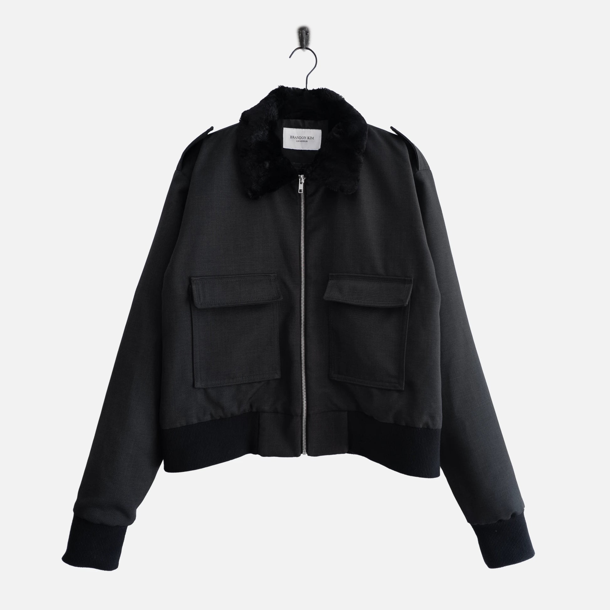 THE FLIGHT JACKET IS CUT FROM A LIGHTWEIGHT CHARCOAL WOOL-SUITING BLEND AND INSTILLED WITH AVIATION STYLE CODES.
